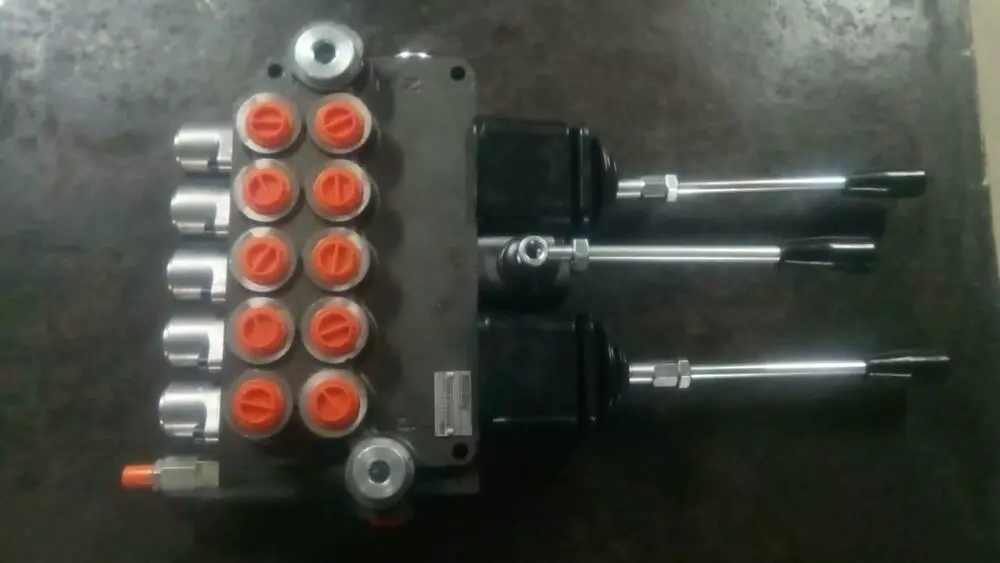 Гидрораспределитель 5Р40 шестисекционный моноблочный импортный производства Badestnost, Болгария с 2 4 координатными джойстиками с номинальной пропускной способностью от 40 л/мин. Возможность управления 2 секциями одним джойстиком : Вверх, вниз - управление 1 секцией ; вправо, влево - управление 2 секцией.В базовой комплектации имеются встроенный клапан давления от 0 до 320 Бар, пружинный возврат ручки в нейтральное положение, как дополнительная опция возможна установка фиксации ручки и плавающего положения, электроуправление, гидроуправление, пневмоуправление, троссиковое управление и механический джойстик 4-х координатный для удобства использования. Резьба 1/2` (управляющие каналы) ― 3/4`(подача и слив)