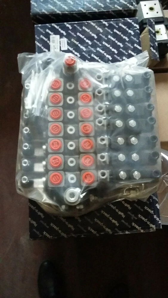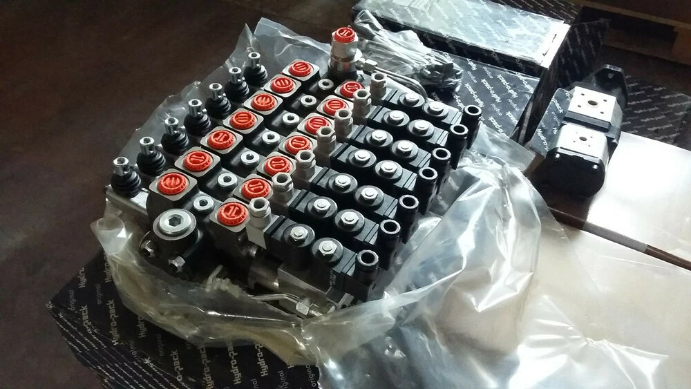 Гидрораспределитель 6-секционный с электромагнитным управлением на 12 или 24 Вольта с нониманальной подачей масла от 100 л/мин импортного производства ведущих турецких заводов гидравлики Hidros, GMS Hydraulics.Имеют встроенный клапан давления, давление подачи Р: 250 Бар, порта слива Т: 50 Бар, каналов А и В: 300 Бар.