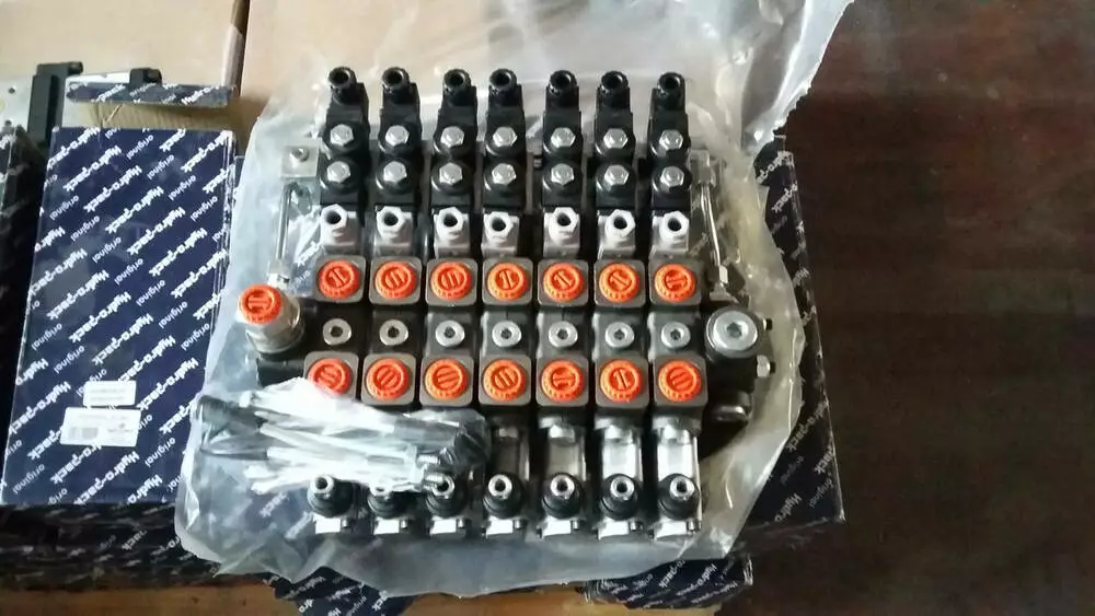 Гідророзподільник 10 секційний з електромагнітним керуванням на 12 або 24 вольти з ноніманальною подаванням оливи від 100 л/хв імпортного виробництва провідних турецьких заводів гідравліки Hidros, GMS Hydraulics.Мають вбудований клапан тиску, тиск подавання Р: 250 барів, порти зливу Т: 50 барів, каналів А і В: 300 Барів.