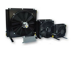 Воздушно-масляные теплообменники являются самыми распространенными. В состав такого теплообменника входят кожух, вентилятор, радиатор и термостат. Внутри радиатора циркулирует гидравлическое масло. Вентилятором создаётся воздушный поток, проходящий через радиатор. Чтобы поддерживать температуру в нужном диапазоне, теплообменники содержат термостат. Он может при необходимости управлять теплообменником, например, отключать его при остывании рабочей жидкости. Особенность воздушно-масляных теплообменников – теплообмен потока воздуха со внешними стенками масляного радиатора.