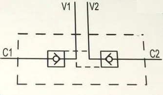 3) Два управляемых обратных клапана (двухклапанный гидрозамок) для запирания гидроцилиндра (на примере гидроцилиндра с равными рабочими площадями)