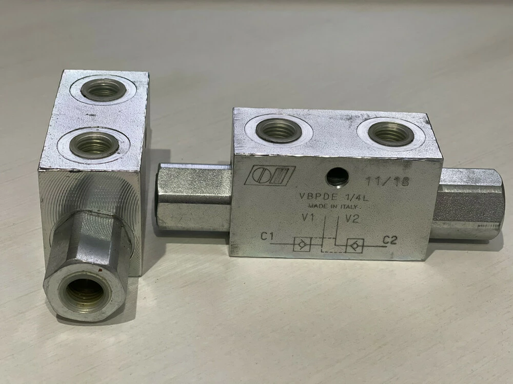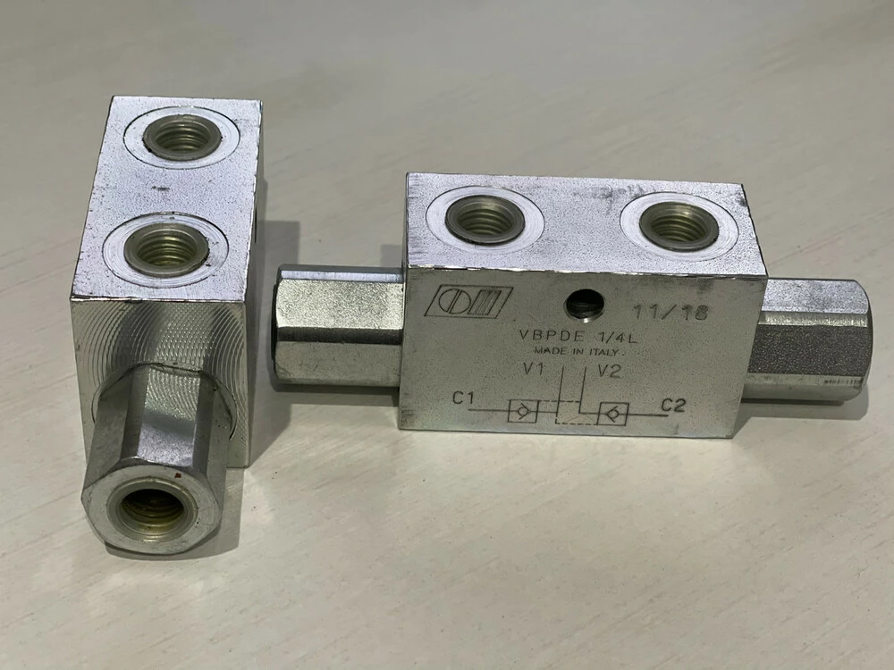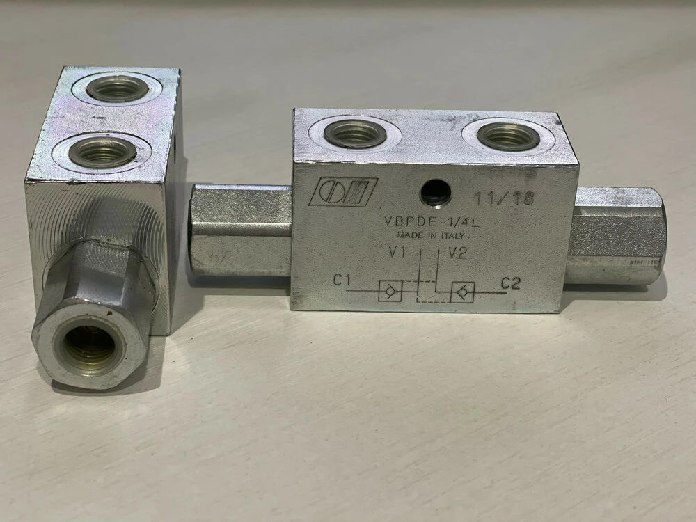 Гидрозамок импортный производство Италия тип VBPDE 1/4" L, данный гидрозамок позволяет свободно пропускать до 20 л/мин потока рабочей жидкости в одном направлении и запирает поток в противоположном направлении до тех пор, пока давление управления (пилотное управление) не откроет запорный элемент.Принцип работы данного гидрозамка VBPDE