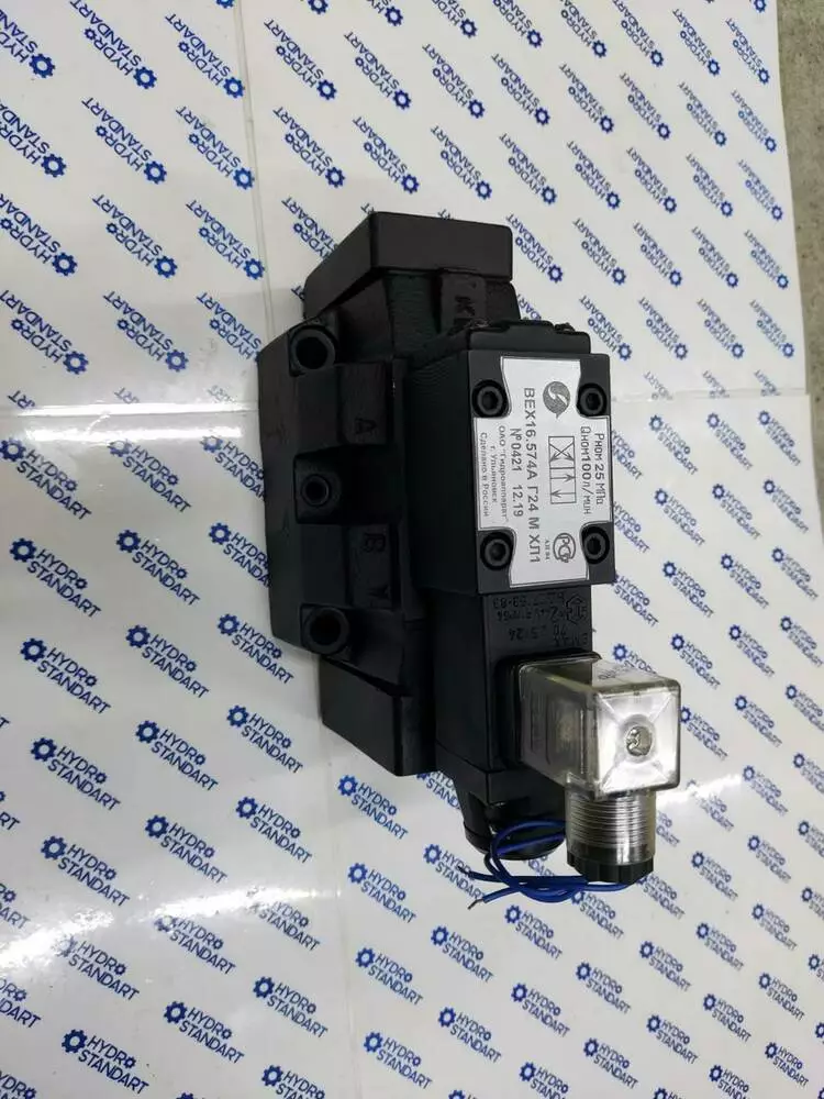 Гідророзподільник ВЕХ16.574 з однобічним електромагнітним керуваннямГідророзподільники ВЕХ-16.574 золотисті чотирилінійні з двостороннім електрогідравлічним керуванням, з умовним проходом 16 мм призначені для керування (зміни напрямку або пуску й зупинки потоками робочих рідин у гідравлічних системах.