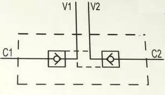 3) Два керованих зворотних клапана (двухклапанный гідрозамок) для замикання гідроциліндра (на прикладі гідроциліндра з рівними робочими площами)