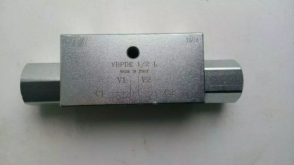 Гідрозамок імпортний виробництво Італія тип VBPDE 1/2" L даний гідрозамок дозволяє вільно пропускати до 50 л/хв потоку робочої рідини в одному напрямку і замикає потік в протилежному напрямі до тих пір, поки тиск керування (пілотне управління) не відкриє запірний елемент.Принцип роботи даного гідрозамка VBPDE