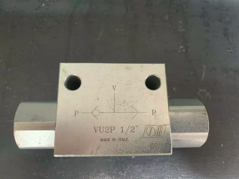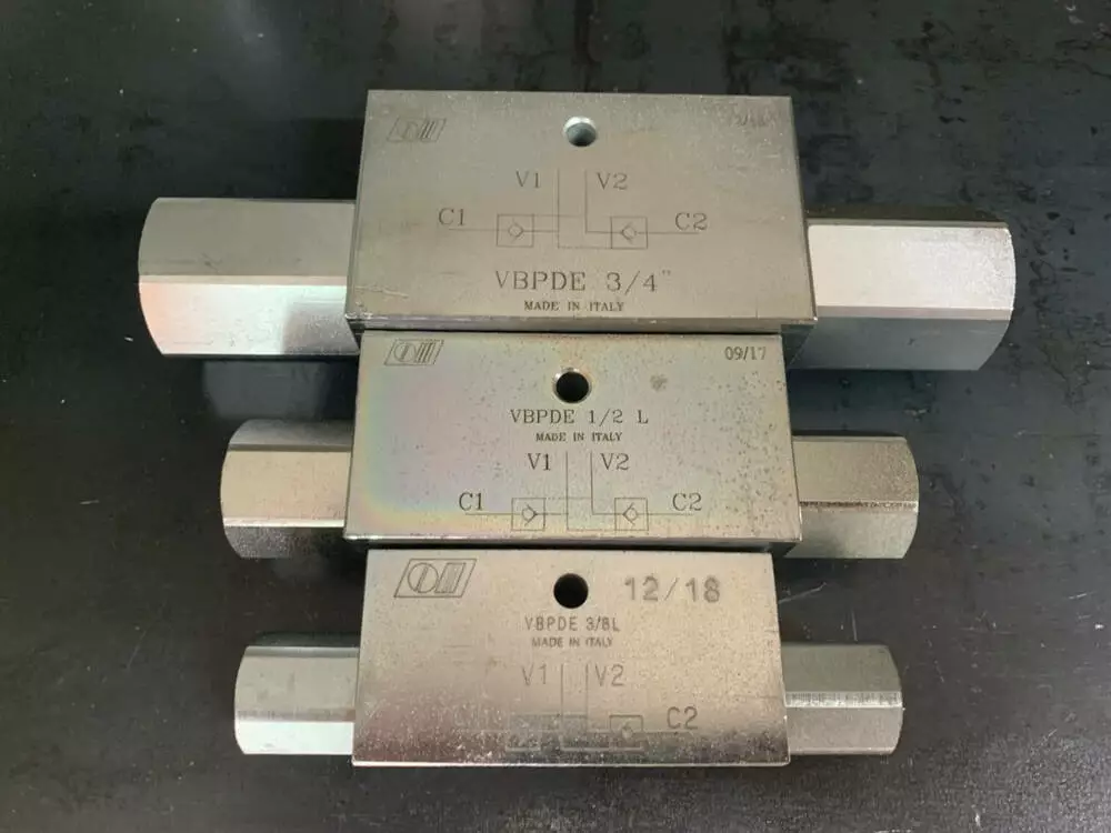 Гідрозамок імпортний виробництво Італія тип VBPDE 3/4" L даний гідрозамок дозволяє вільно пропускати до 100 л/хв потоку робочої рідини в одному напрямку і замикає потік в протилежному напрямі до тих пір, поки тиск керування (пілотне управління) не відкриє запірний елемент.Принцип роботи даного гідрозамка VBPDE
