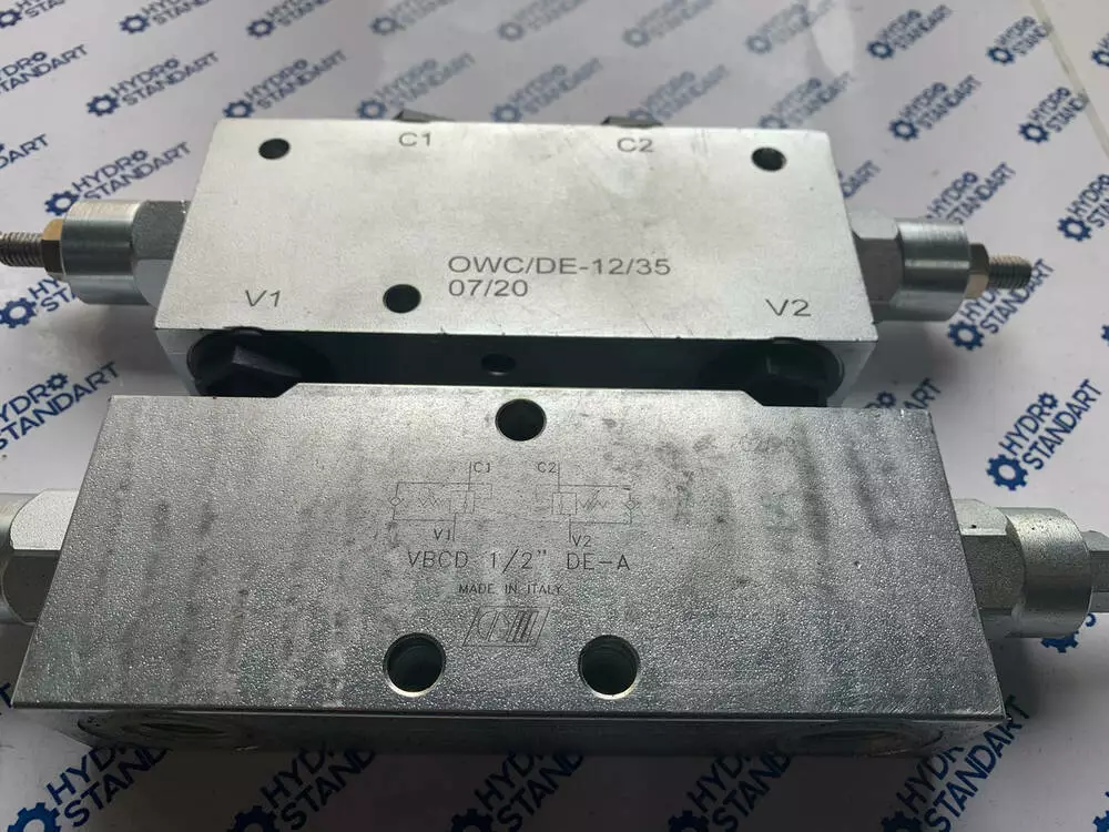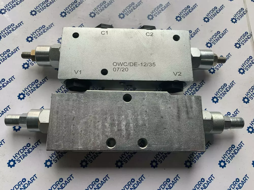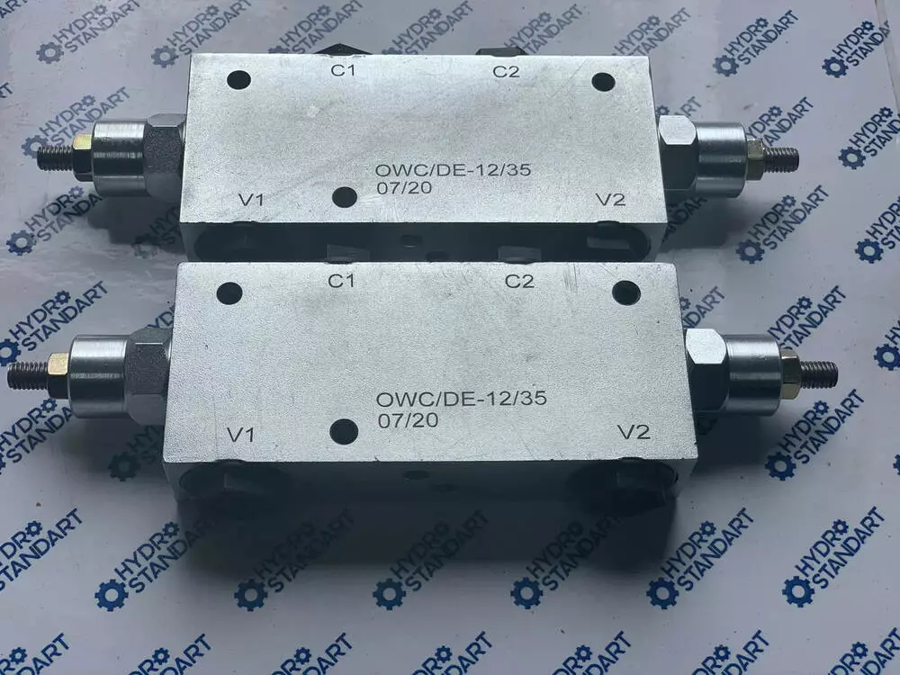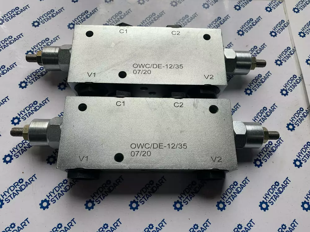 Високоякісний клапан гальмівний (підпірний, врівноважувальний, оверцентр) OWC/DE-12/35 Double overcentre Valves for centre Closed -Type A , двосторонньої дії пропускною здатністю 60 л/хв виробництва Болгарії.Гальмівні клапани OWC/DE застосовують у приводах механізмів опускання вантажу кранів, пневмоколісного ходу екскаваторів, навантажувачів та інших самохідних машин для виключення протиобгінного швидкісного режиму під час дії навантажень, напрямок яких збігається з напрямком обертання двигуна.