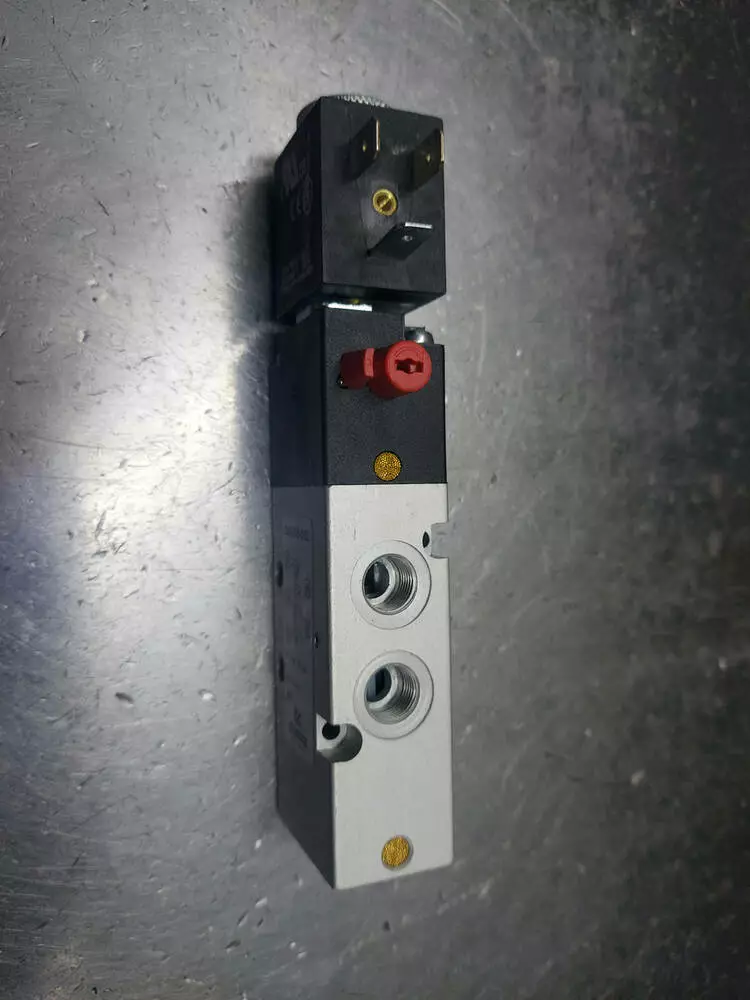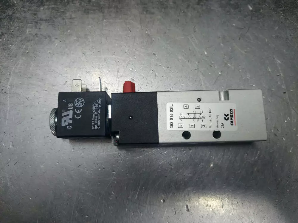 Розподільник Camozzi 458-015-22 з однобічним електропневматичним керуванням, 5/2 моностабільний із пружинним поверненням, витрата повітря: 650 Нл/хв, приєднання: G1/8”, з ручним дублюванням під викрутку. Розподільник постачається без котушки та роз'єму, які замовляються окремо. • Конструкція: золотистого типу.